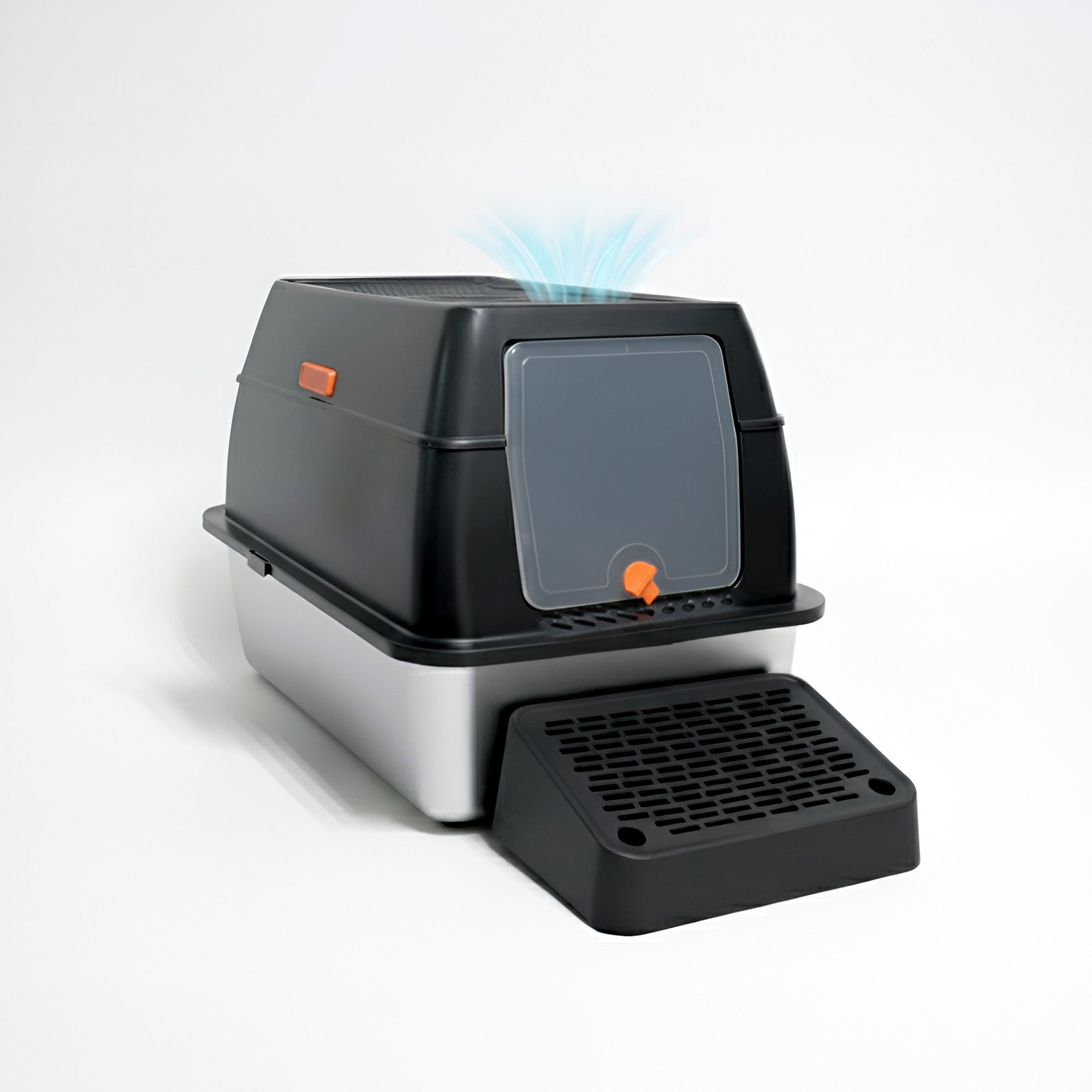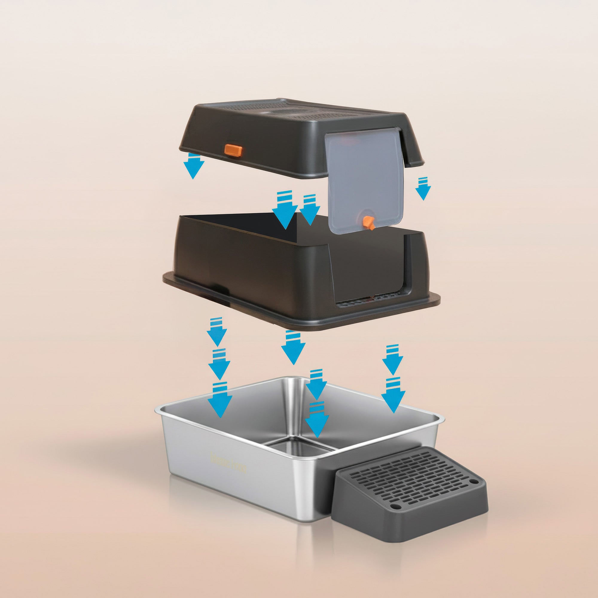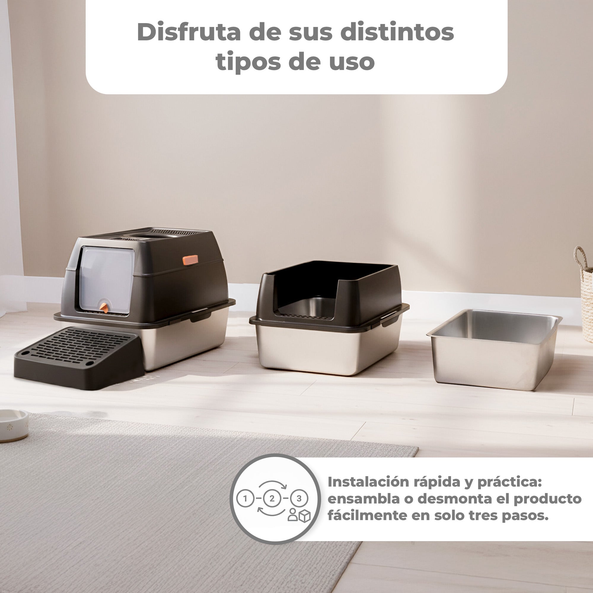 ARANERO 3 EN 1: Abierto, Semi-Cerrado y Cerrado. Diseñado para adaptarse a las necesidades de cada gato. Modo Abierto: ideal para gatos que prefieren espacio y ventilación. Modo Semi-Cerrado: reduce salpicaduras sin perder visión. Modo Cerrado: mayor privacidad y mejor control de olores. Un solo arenero, tres formas de uso.