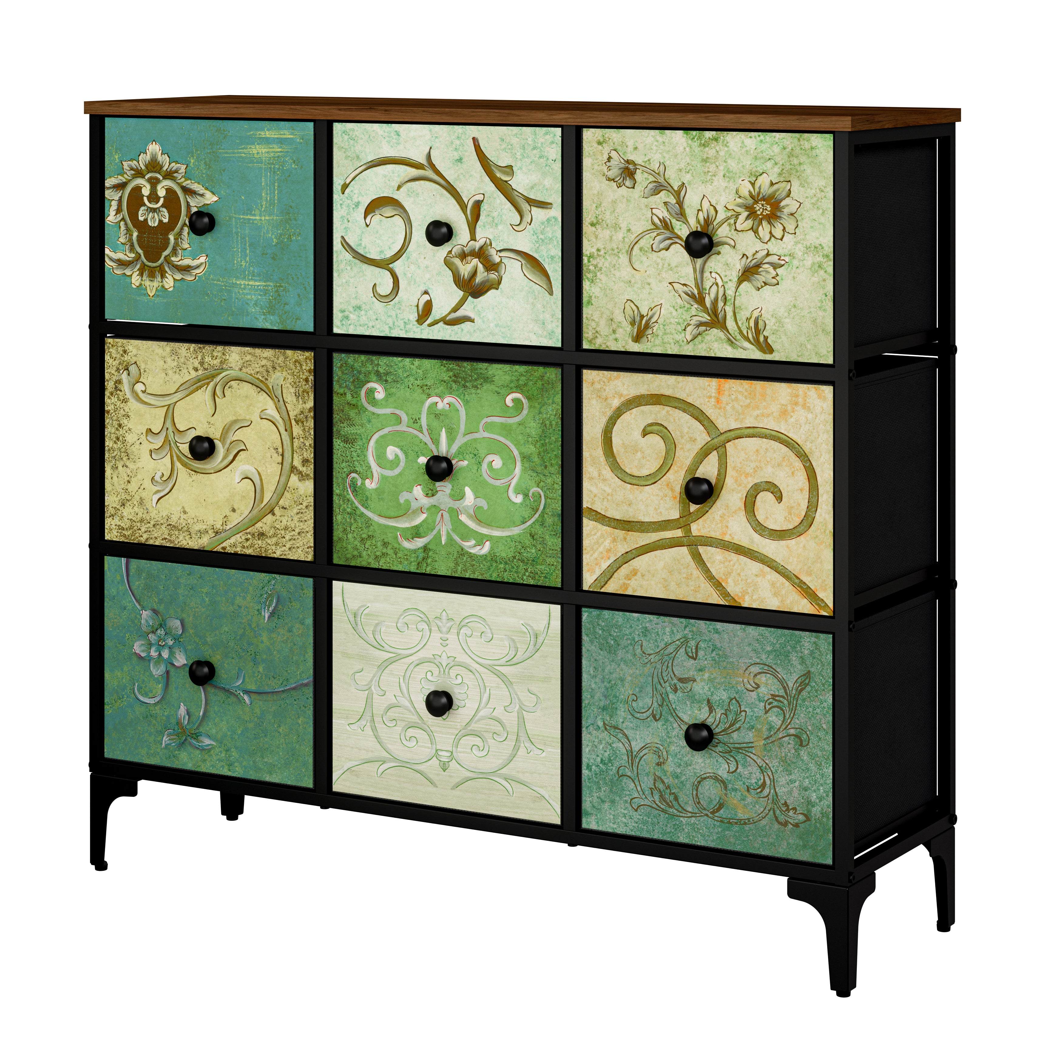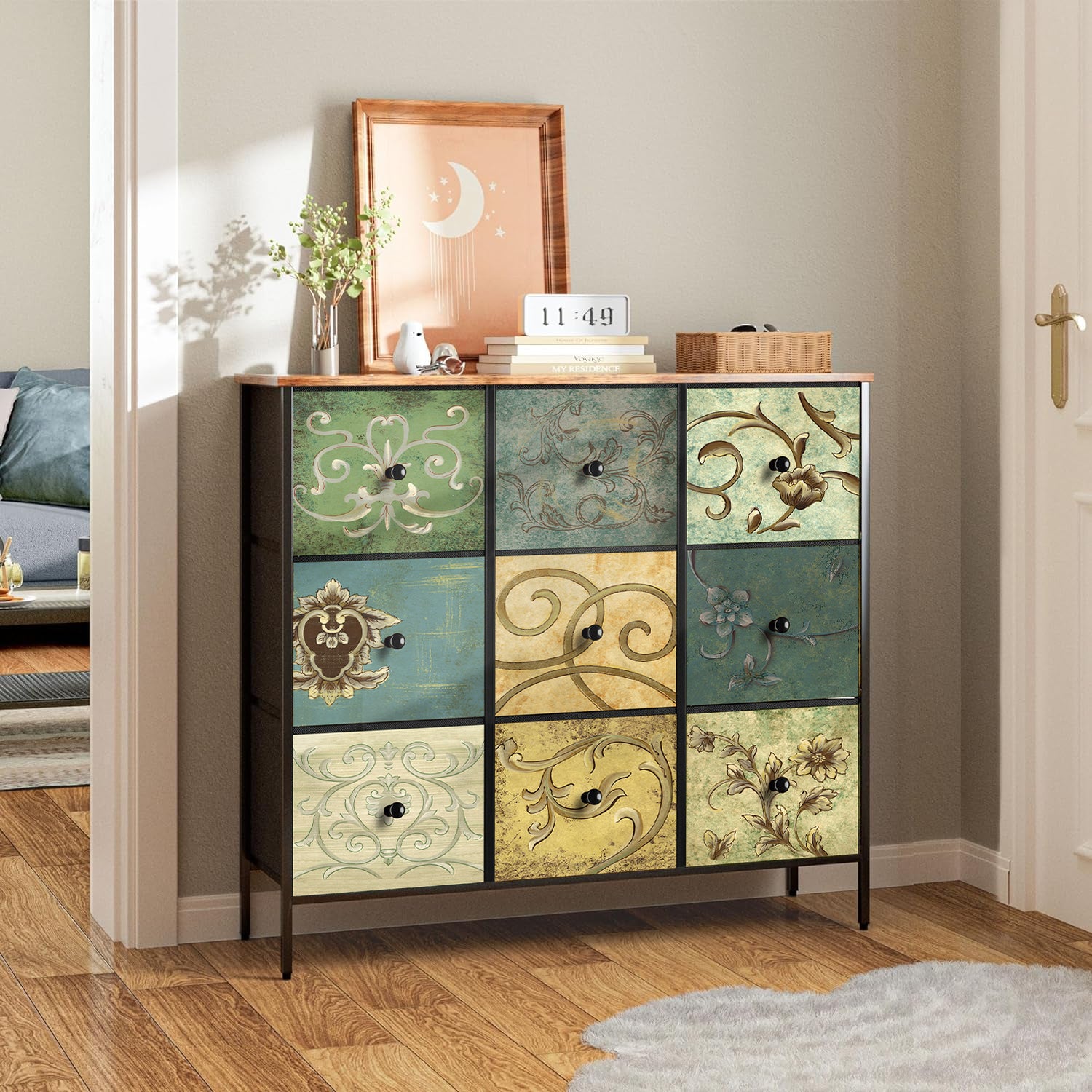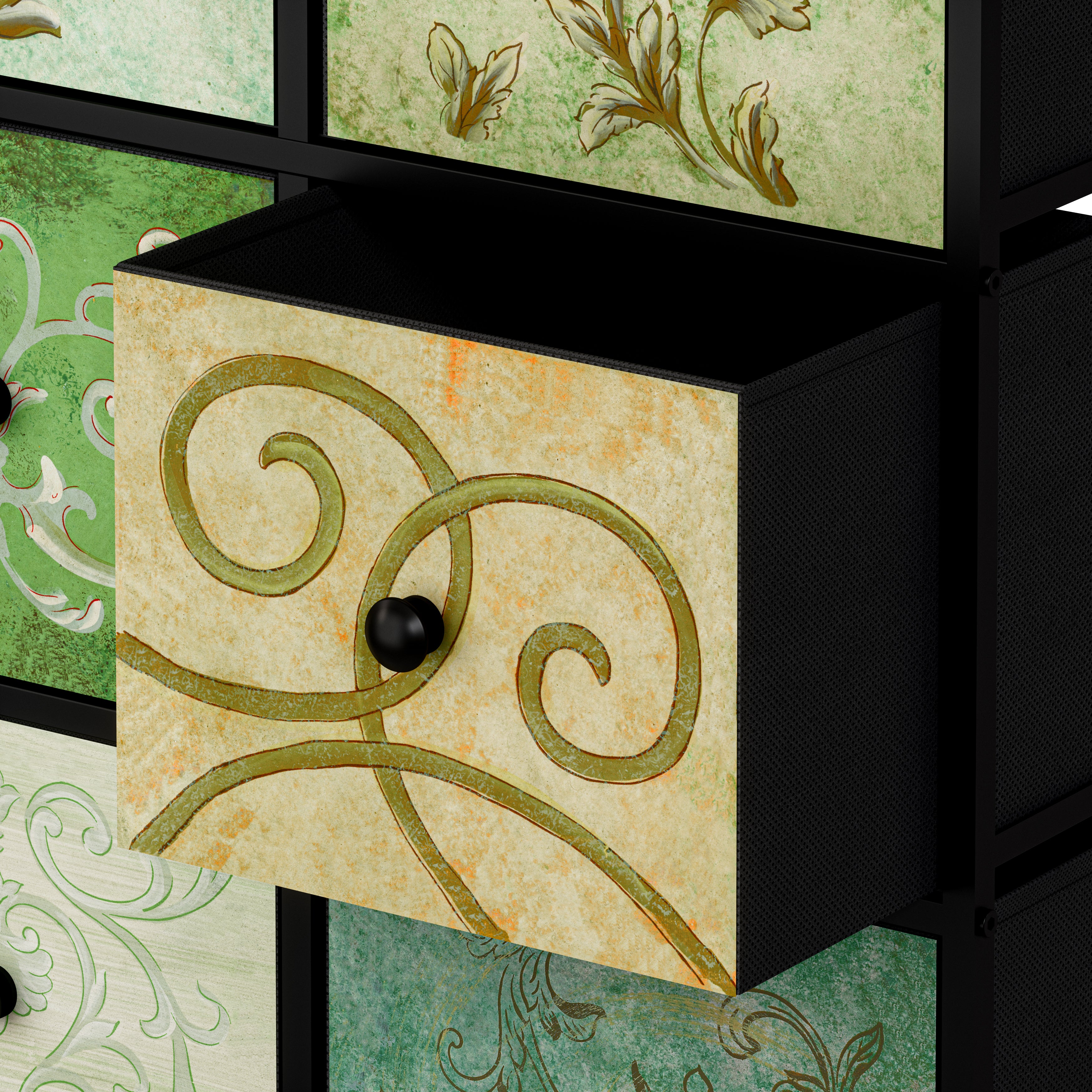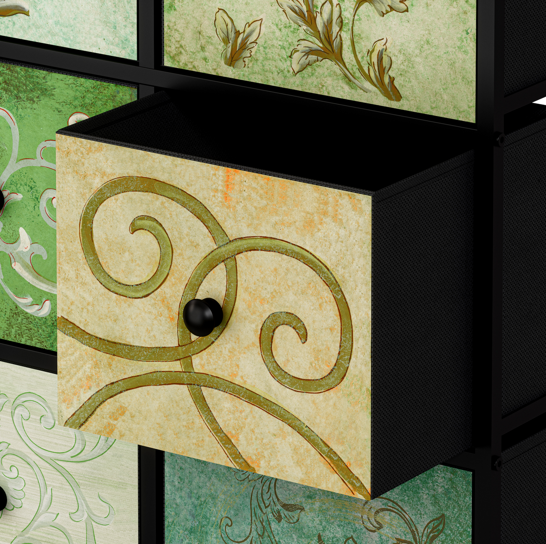 CONSTRUCCIÓN DURABLE: Marco de metal resistente combinado con tablero MDF de alta calidad y cajones de tela con diseños impresos