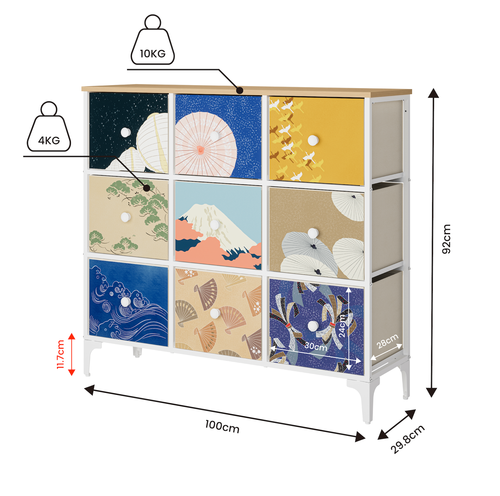 DISEÑO VERSÁTIL: Organizador con 9 cajones de tela y estructura metálica, mide 100x29.8x92cm, perfecto para dormitorio, oficina o cualquier espacio que necesite almacenamiento adicional